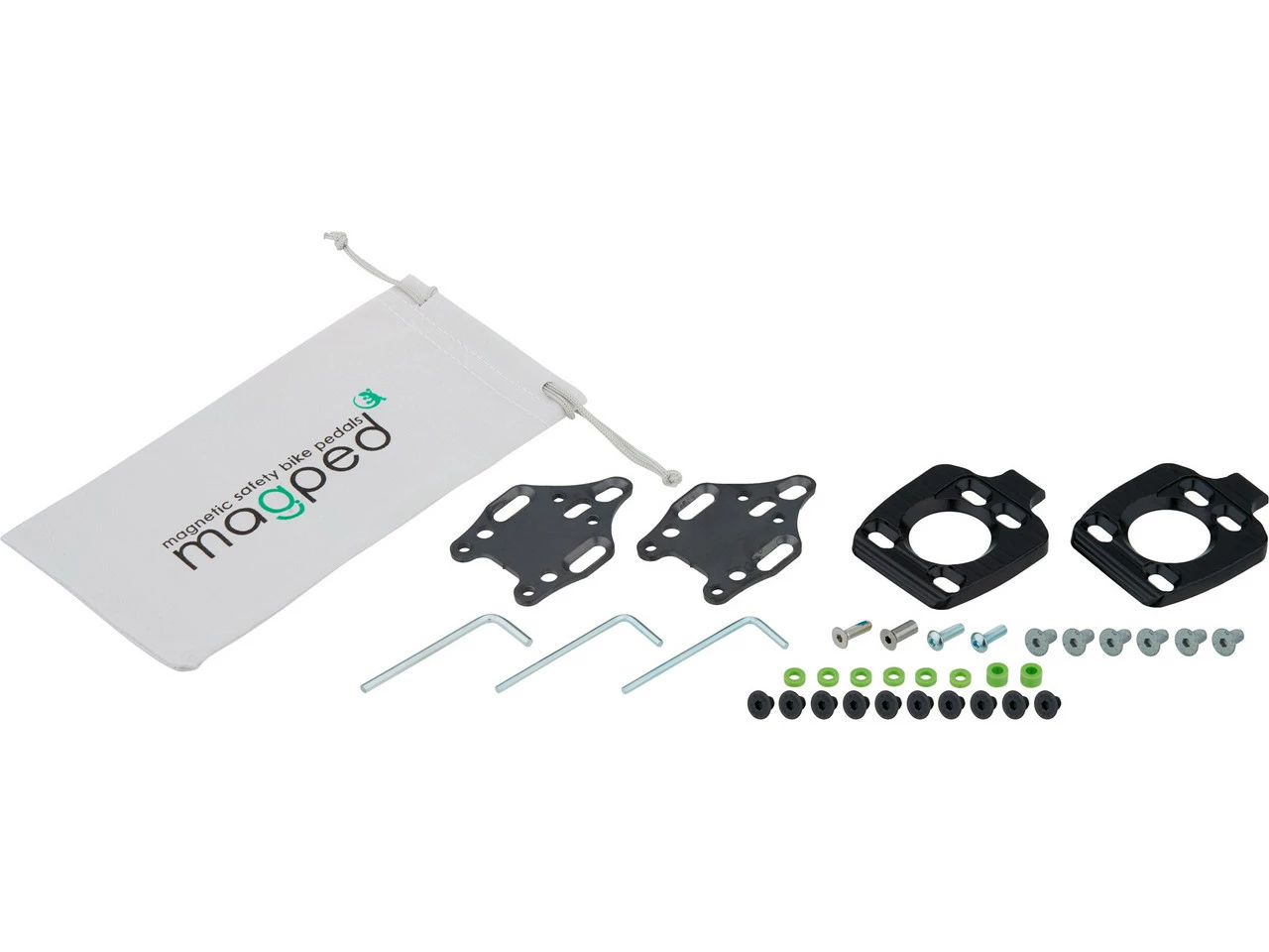 Lieferumfang:1 Paar Pedale magped Road (links und rechts)2 x Magnet magped 200 N1 Paar Schuhplatten magped Road Metall1 Paar Schuhplatten magped Kunststoff10 x Schraube magped zur Schuhplattenbefestigung, schwarz6 x Schraube magped zur Schuhplattenbefestigung, silber6 x Unterlegscheibe magped zur Schuhplattenbefestigung2 x Schraube magped2 x Distanzstück magped3 x Innensechskant magpedDirekt mitbestellen:Neodym-Ersatzmagnete