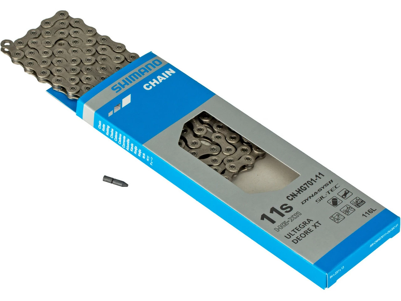 Die Shimano 11-fach Kette CN-HG701-11 ist eine laufrichtungsgebundene, hochwertige HG-X11 Kette, die perfekt zu Ultegra und XT Gruppen passt. Dank neu dimensionierter Laschen kann sie in der Version mit 138 Gliedern aber auch für E-Bikes eingesetzt werden. CN-HG701-11 Ketten überzeugen mit Effizienz, Wartungsarmut und reibungsloser Schaltperformance, was nicht zuletzt an der SIL-TEC Oberflächenbeschichtung liegt. Es handelt sich um die klassische Version mit Kettennietstift.