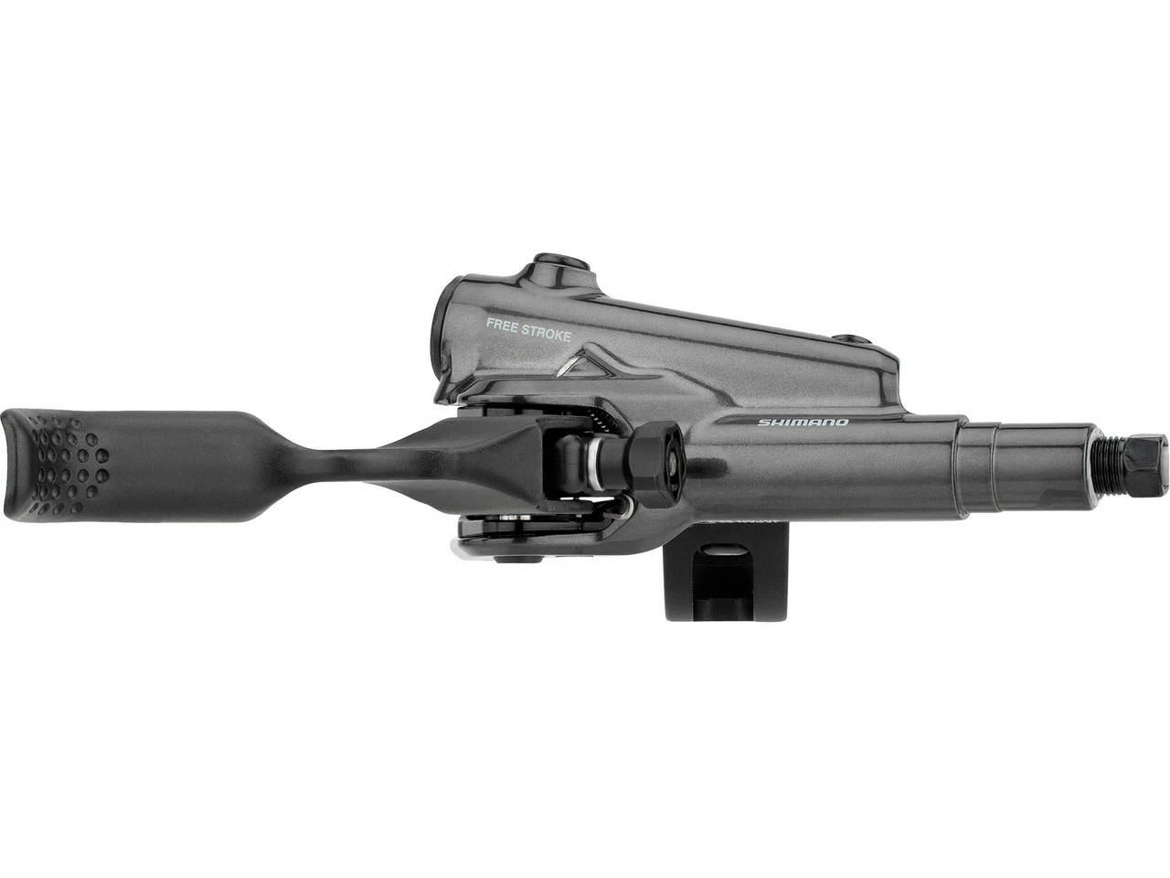 Die Scheibenbremse umfasst auch den Bremsgriff XT BL-M8100, der schräggestellt montiert wird, sodass sich ein zusätzlicher Kontaktpunkt ergibt. Das erhöht die Steifigkeit und sorgt für ein direkteres Feedback. Außerdem verstärkt Shimano Servo Wave die Bremsleistung: bei kürzerem Leerweg steht mehr Performance zur Verfügung. Die Griffweite lässt sich über einen Einsteller werkzeuglos justieren; außerdem ist der Druckpunkt über einen Kreuzschraubendreher einstellbar. Der Bremsgriff ist mit I-Spec-EV-Schaltgriffen kompatibel, sodass Du Dein Cockpit individuell und aufgeräumt gestalten kannst. Sowohl Hebel als auch Hauptzylinder sind aus leichtem Aluminium gefertigt.